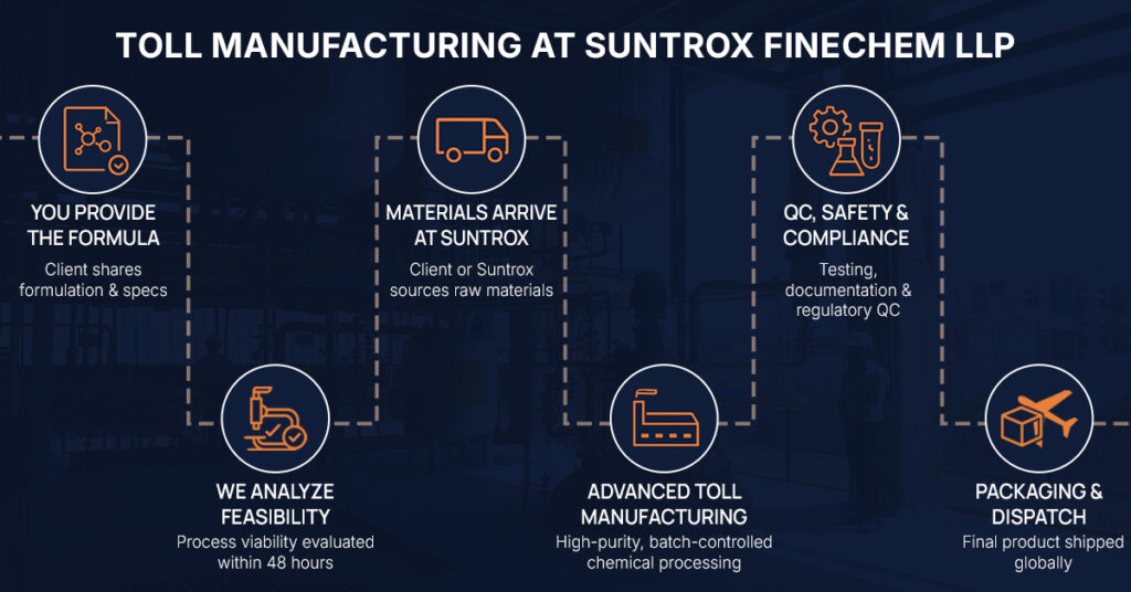 Suntrox Finechem LLP is strategically positioned to serve global markets with reliable, high-purity chemical intermediates and custom-manufactured specialty products. Our robust infrastructure at Dahej, India’s most powerful chemical manufacturing hub, is engineered for international-grade quality and export-ready compliance.